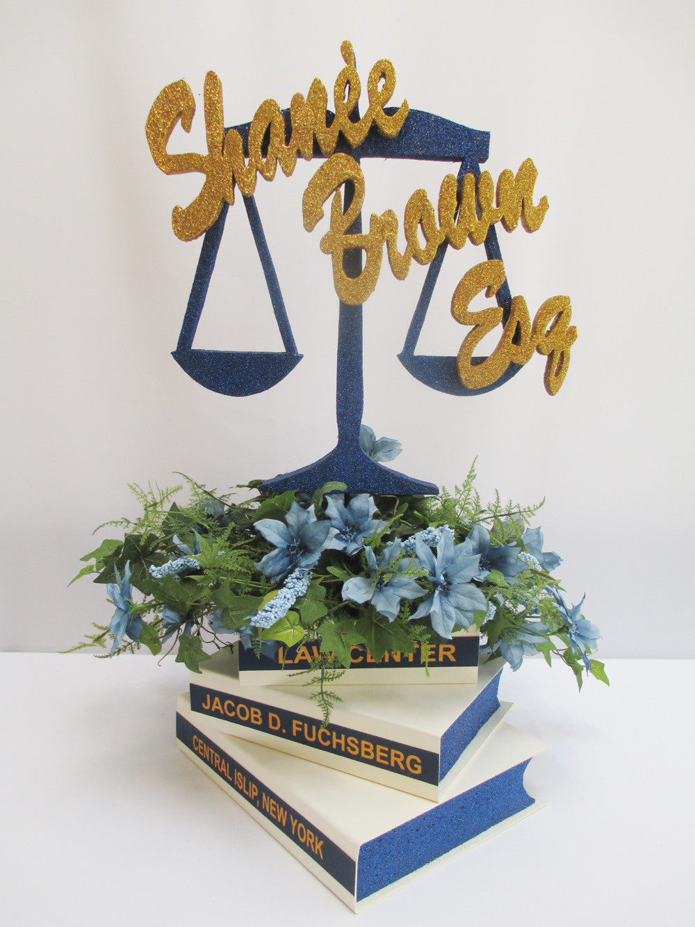 All of these centerpieces include our custom stack of books as the base. Each one although on the same base have their own unique look and celebrate the graduate in high style. The medical symbol (Caduceus) stands tall in a base of silk greenery and orange mini roses. Cute saying reflecting the students time in school make for a very personal centerpiece. A faux diploma states the year and the students name. Below are samples of the scales of justice table centerpieces. Each features our custom cut Styrofoam scales mounted on a base of silk greenery and silk flowers while each creating a different look by changing the choice of colors and flowers.