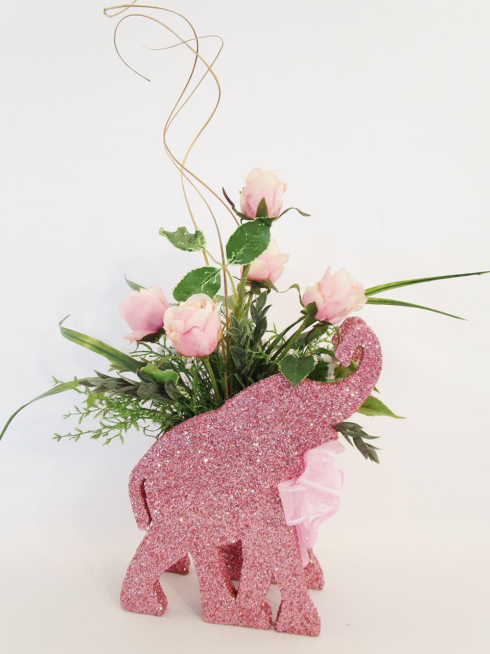 This cute Elephant themed floral centerpiece would be great for a baby shower or any event with an elephant theme. Pink silk roses and greenery arranged in the center between 2 elephant cutouts.