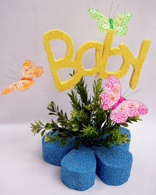 We have unique baby themed centerpieces using our Styrofoam cutouts, silk flowers and greenery as well as other embellishments.
