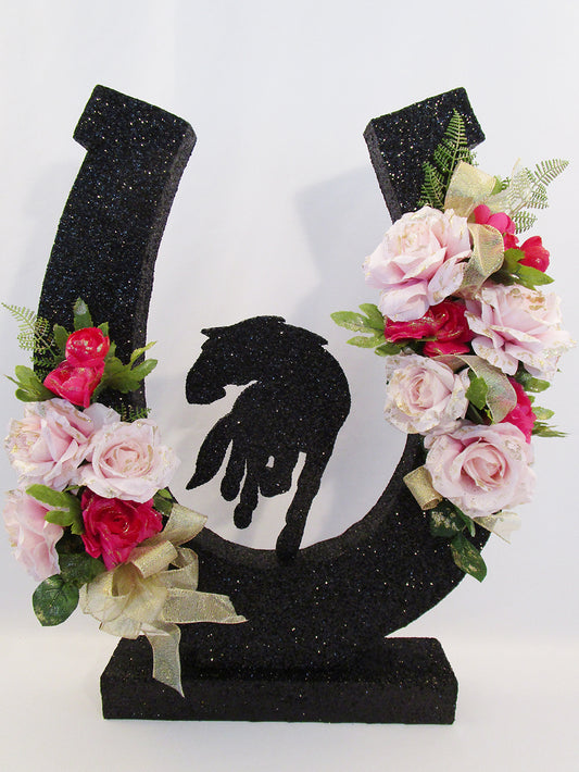 Large Black Horseshoe with Silk Roses & Horse cutout