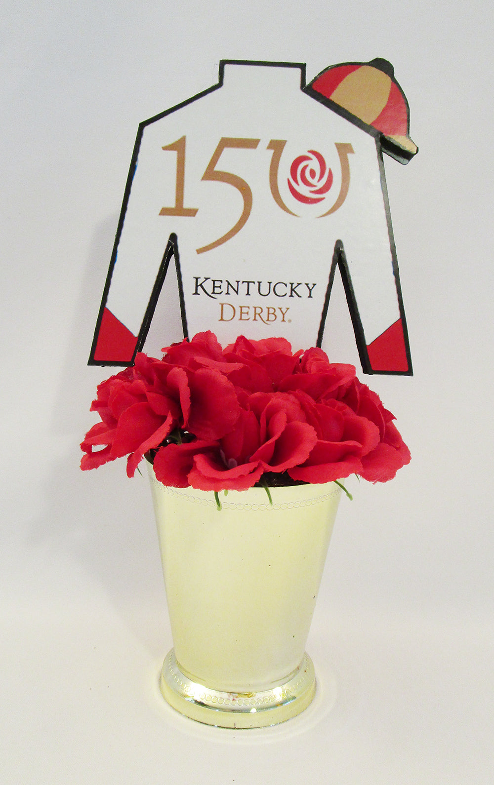 This cute 150th Kentucky Derby jockey silk nestled into the gold mint julep container filled with small red roses.