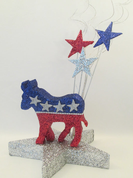 A large variety of table centerpieces with a patriotic theme celebrating the USA and Americana & Canada. Festive and colorful. Also, political cutouts of the GOP Elephant and Democratic Donkey