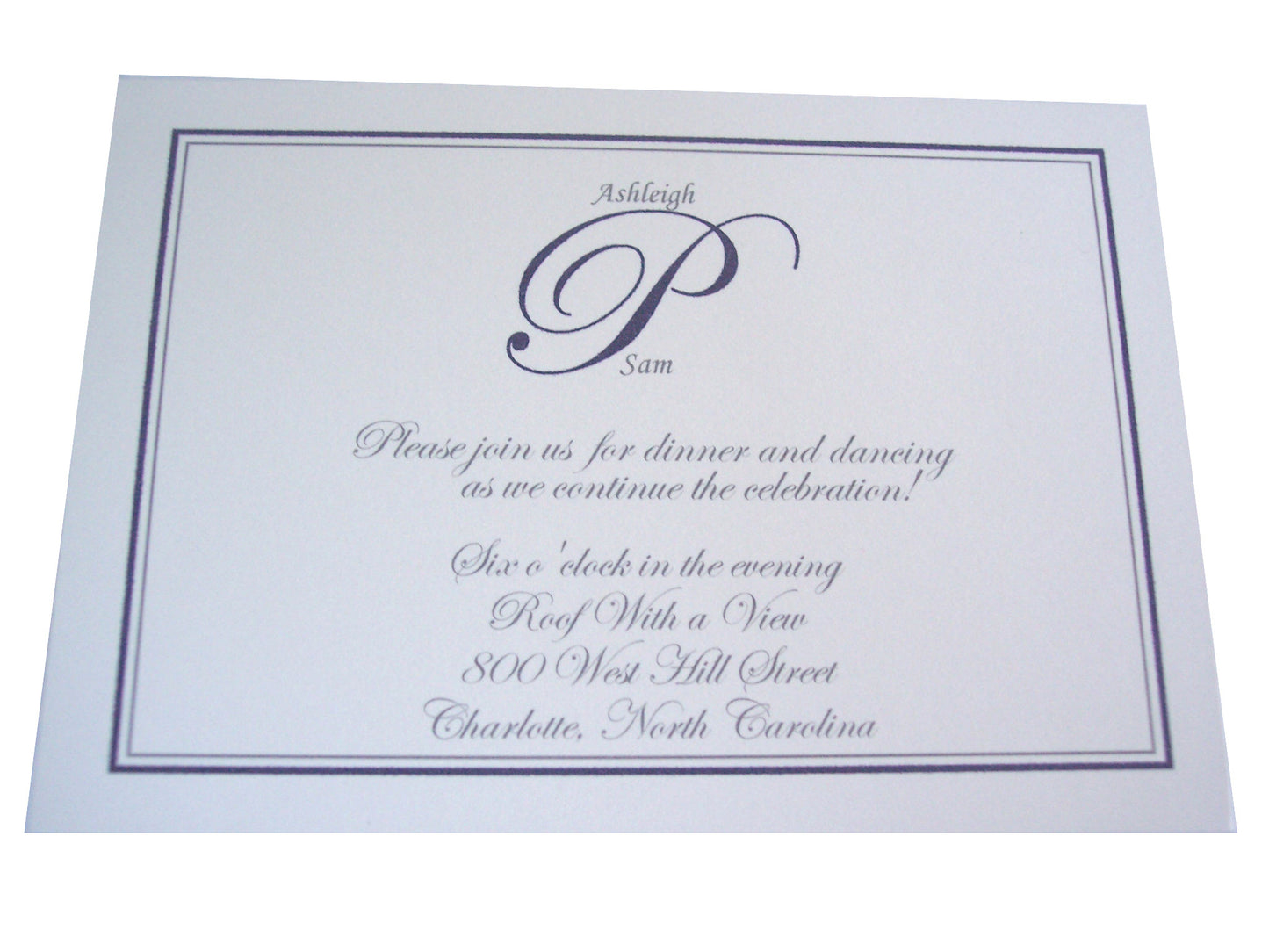 Dark blue linen cover with a soft white metallic invite makes this a beautiful invitation. Back pocket holds the response postcard and reception (fold over with additional info inside fold). Special feature on the response card is that the guests names are printed on the card so they don't have to fill their name in eliminating the possibility of getting a response card back with no name on it which does happen. A matching thank you adds a special touch.
