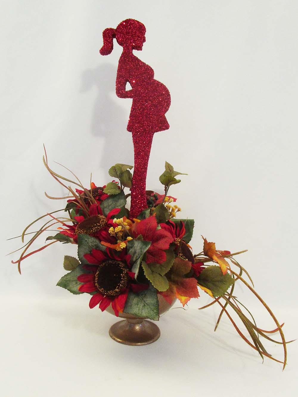 Having a baby shower in the fall, this is the perfect table centerpiece with our custom pregnant momma cutout in a cherry red color nestled in a bed of deep red silk sunflowers fall leaves and greenery for a touch of fall with sprays added a bit of pizzazz in a bronze colored container.