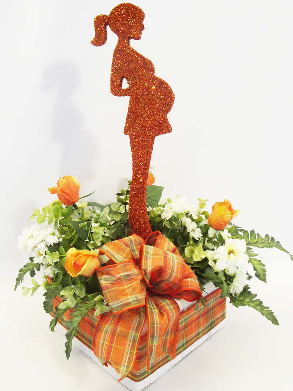 Our vibrant orange pregnant momma styrofoam cutout sets the stage for this baby shower centerpiece, standing on top of our custom white glittered square base that is wrapped with a orange plaid ribbon with matching bow on top along with 4 silk ornage stem roses, white silk flowers and greenery creating a posh baby shower table centerpiece.