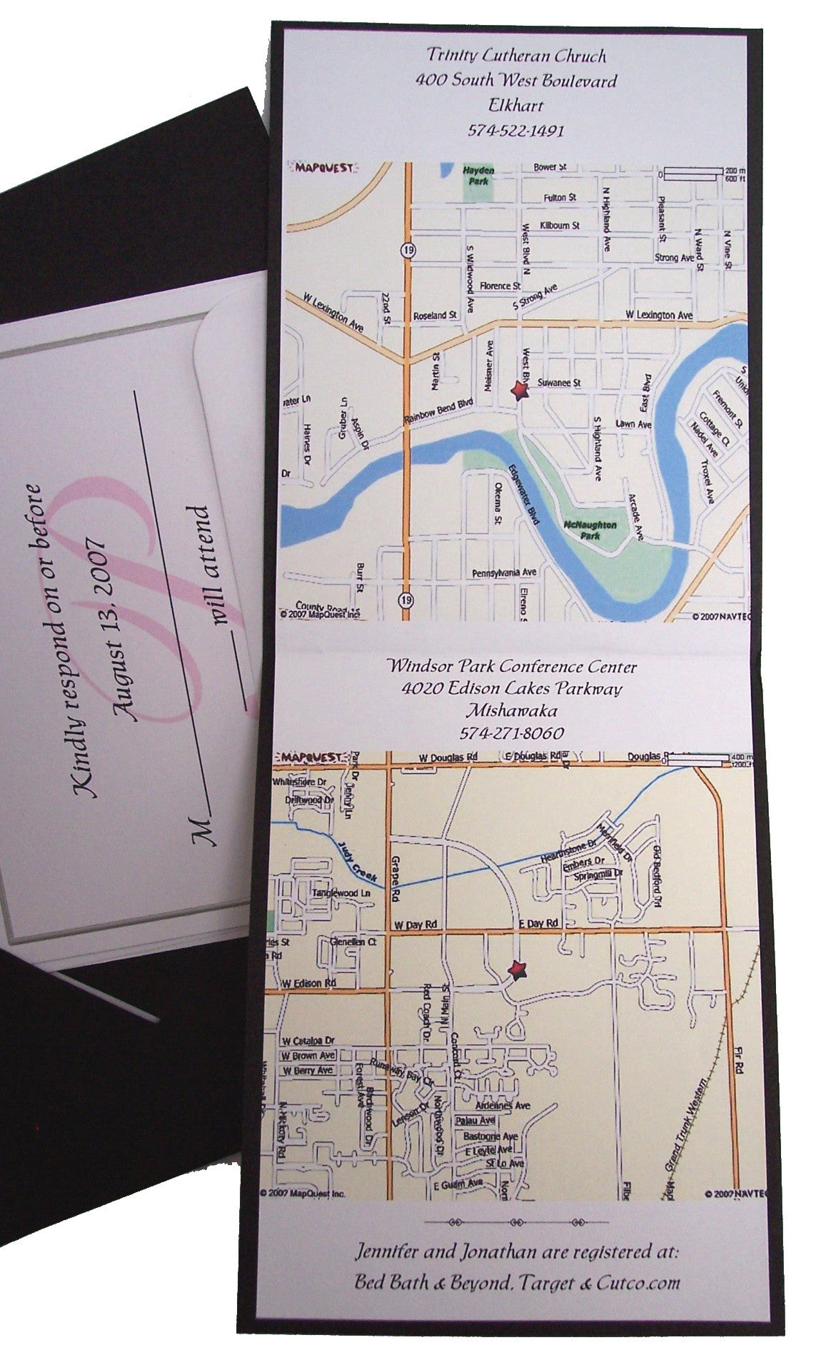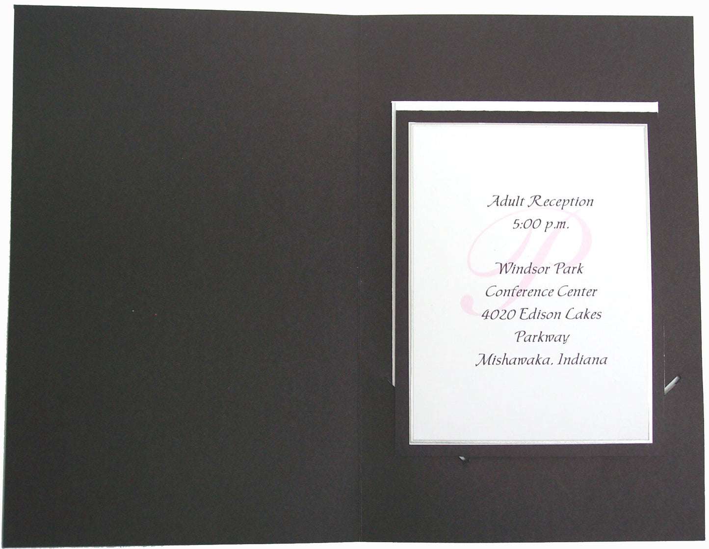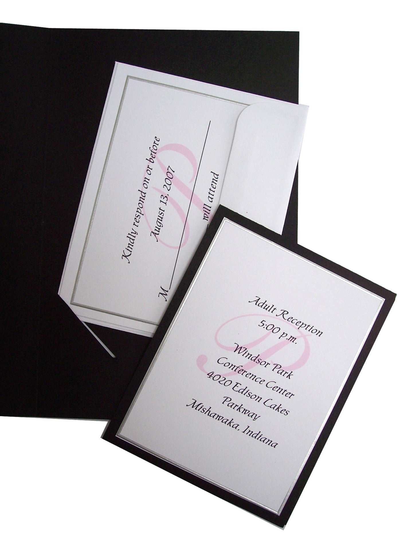 Black, silver and white with a touch of pink were the theme colors for this wedding. The invitation itself has a silver metallic border and silver metallic hearts in the top center. A pink watermark monogram is featured underneath the wedding information. The invitation is placed on a black backer card that is actually a booklet cover. Inside slits were added to hold the response and reception cards. The reception card opens up to a full page of maps and directions. Very unique!