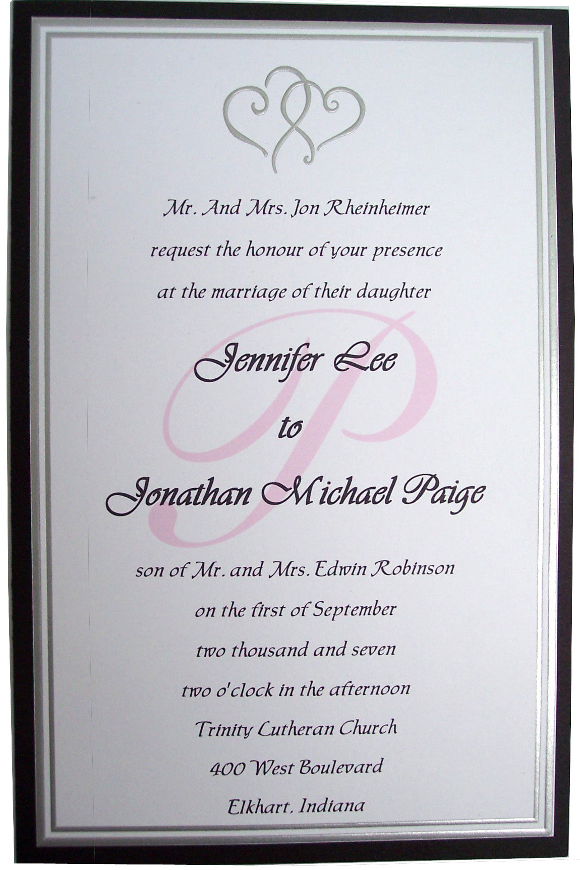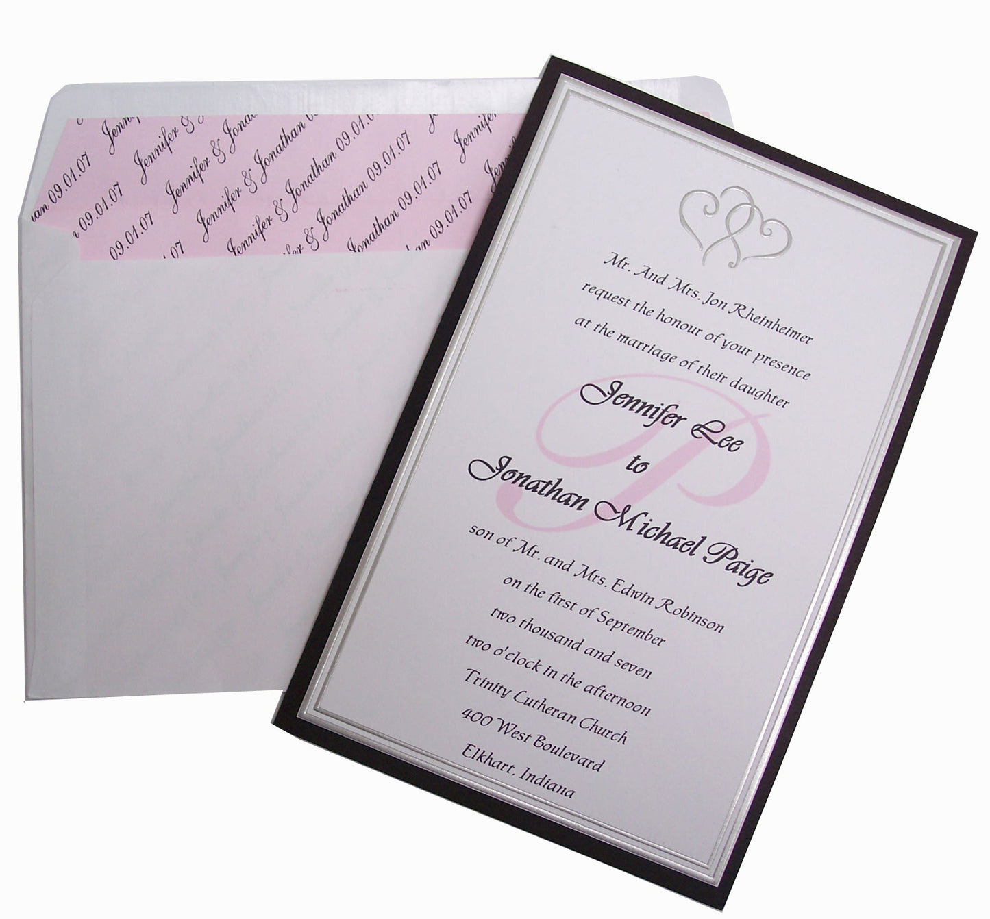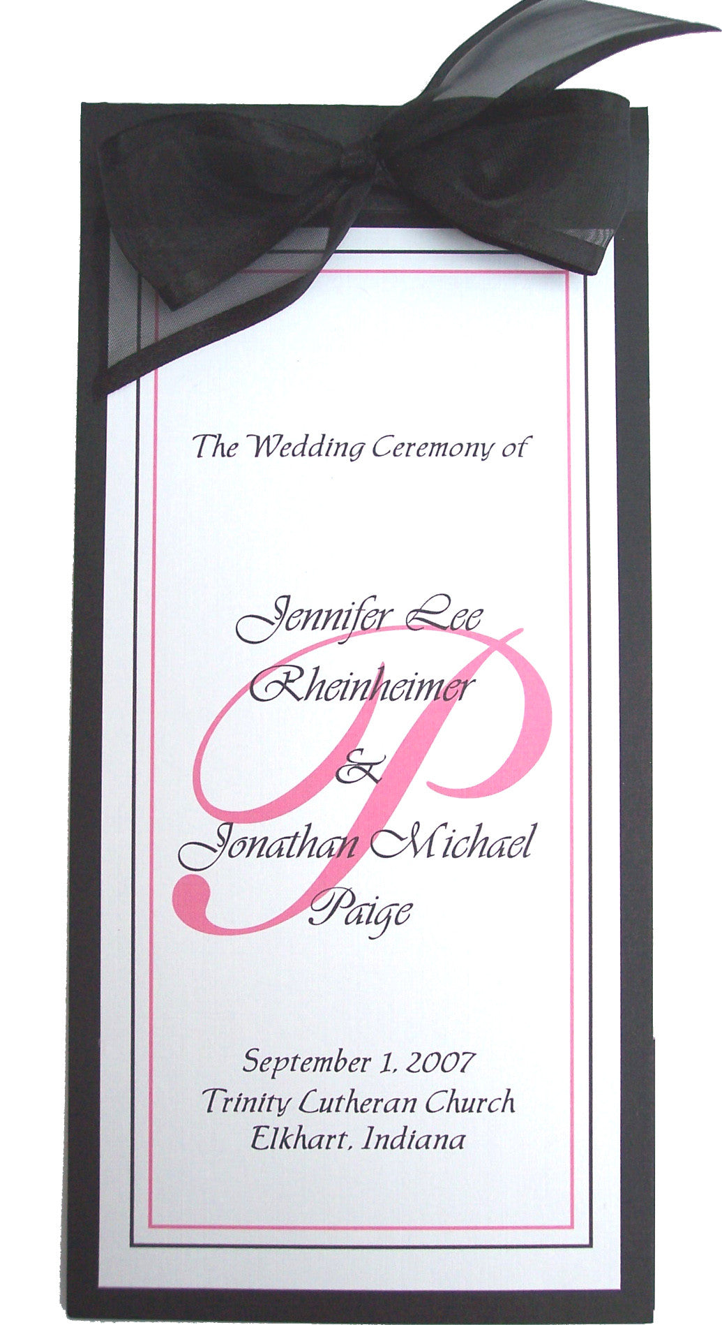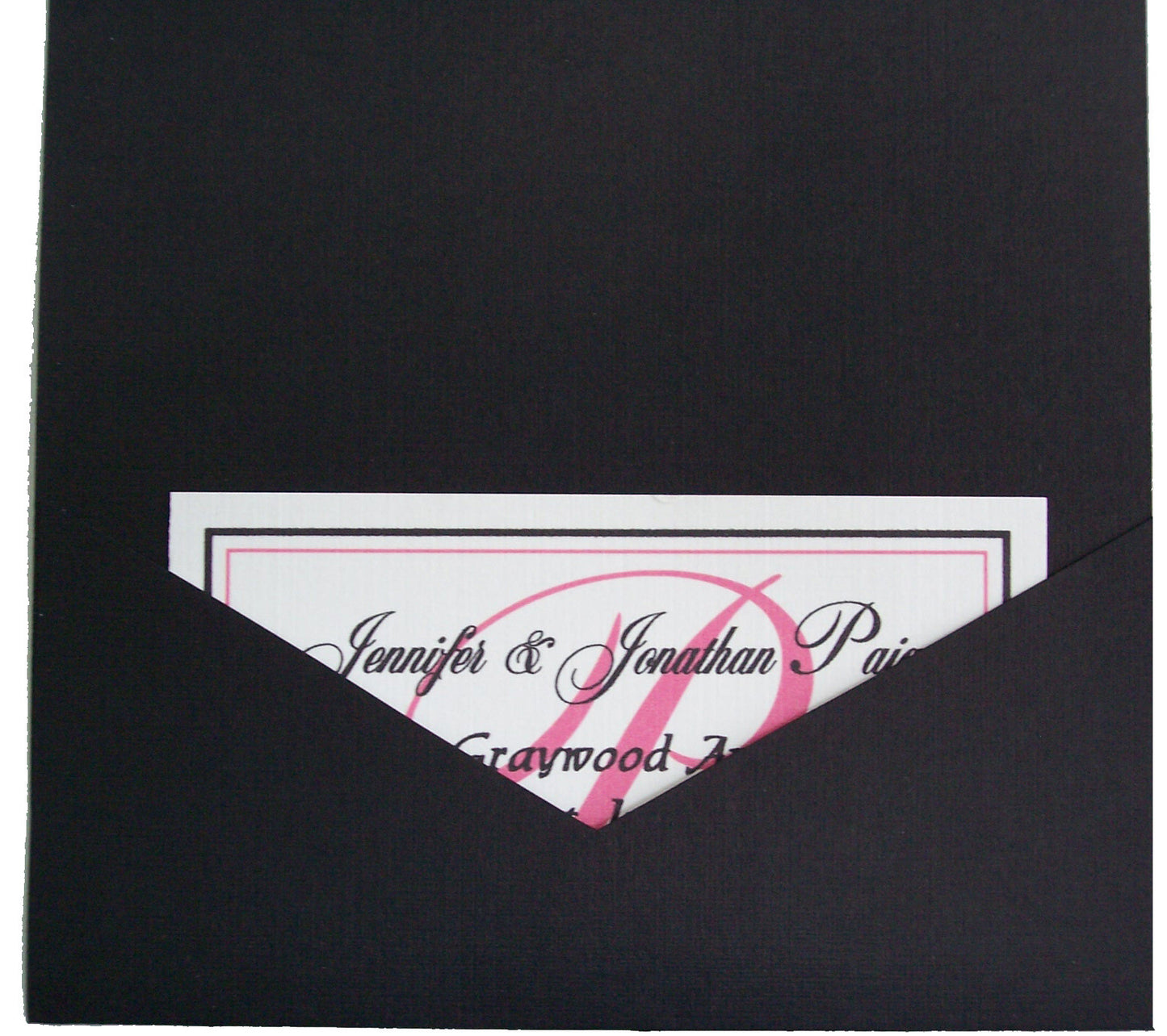 Black, silver and white with a touch of pink were the theme colors for this wedding. The invitation itself has a silver metallic border and silver metallic hearts in the top center. A pink watermark monogram is featured underneath the wedding information. The invitation is placed on a black backer card that is actually a booklet cover. Inside slits were added to hold the response and reception cards. The reception card opens up to a full page of maps and directions. Very unique!