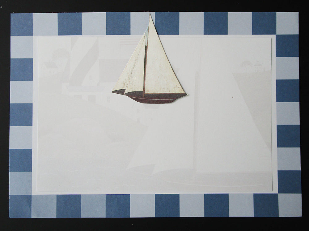 blue check backer 6" x 8.50", overlay card with purple strip border -4.5" x 7", die cut sail boat attachment