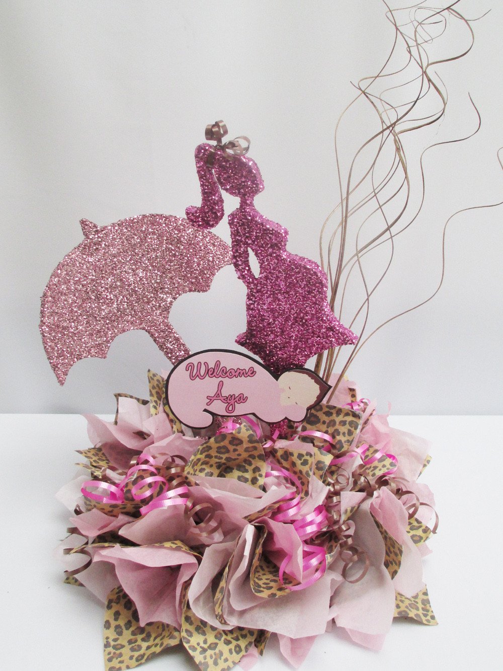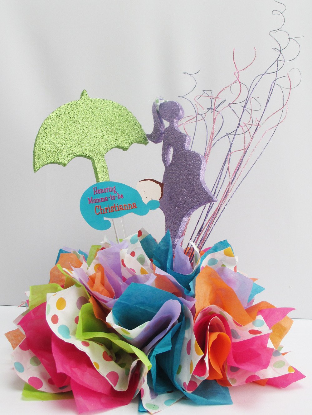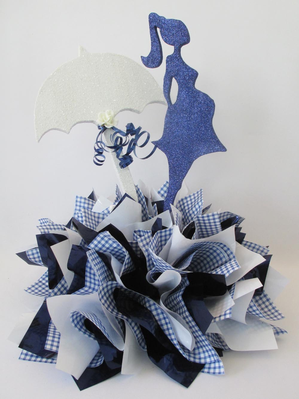 For this baby shower table centerpiece we used one of our metallic tissue base for a fun centerpiece with our custom pregmant women and unbrella cutout and a custom cutout of a baby or a sweet touch.